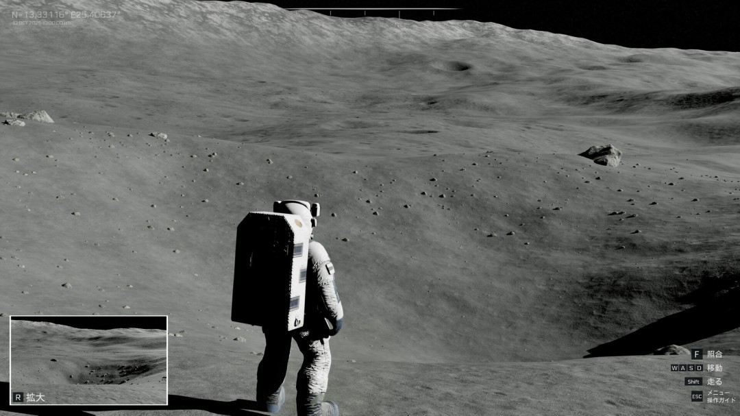这款月球模拟游戏允许玩家自由探索月球表面,其表面是根据实际观测数据精确还原,玩家可以步行或驾驶月球车(车辆)进行探索。逼真的月球环境是通过与日本宇宙航空研究开发机构(JAXA)联合研究开发的模拟环境重建。