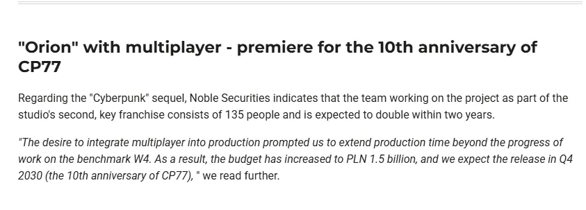 一位波兰分析师预测,代号为“猎户座计划”(Project Orion)的《赛博朋克2077》续作将于2030年Q4发售。与原作不同的是,续作首发将包含多人游戏模式。