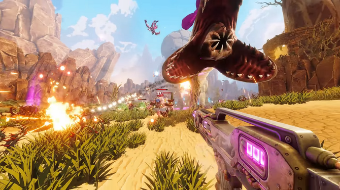 ·《Slyders》有着卡通渲染的画面,以及无数蜂拥而至的敌人,儿童玩家则有着海量的各种枪支武器应对,比起《无主之地》的漫长故事线设定,本作更偏向快节奏的短平快玩法,一局战斗15分钟左右让玩家杀个爽。