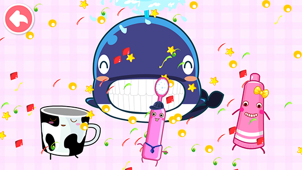 3、大功告成!当宝宝成功将鲸鱼的牙齿刷干净后,鲸鱼会开心地笑出声来,并且向宝宝展示它洁白的牙齿;这时,宝宝会感到自己的努力得到了回报,同时也会更加珍惜自己的牙齿健康;