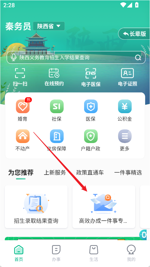 1、打开秦务员App,进入首页并点击「高效办成一件事专区」,选择「教育入学一件事」。