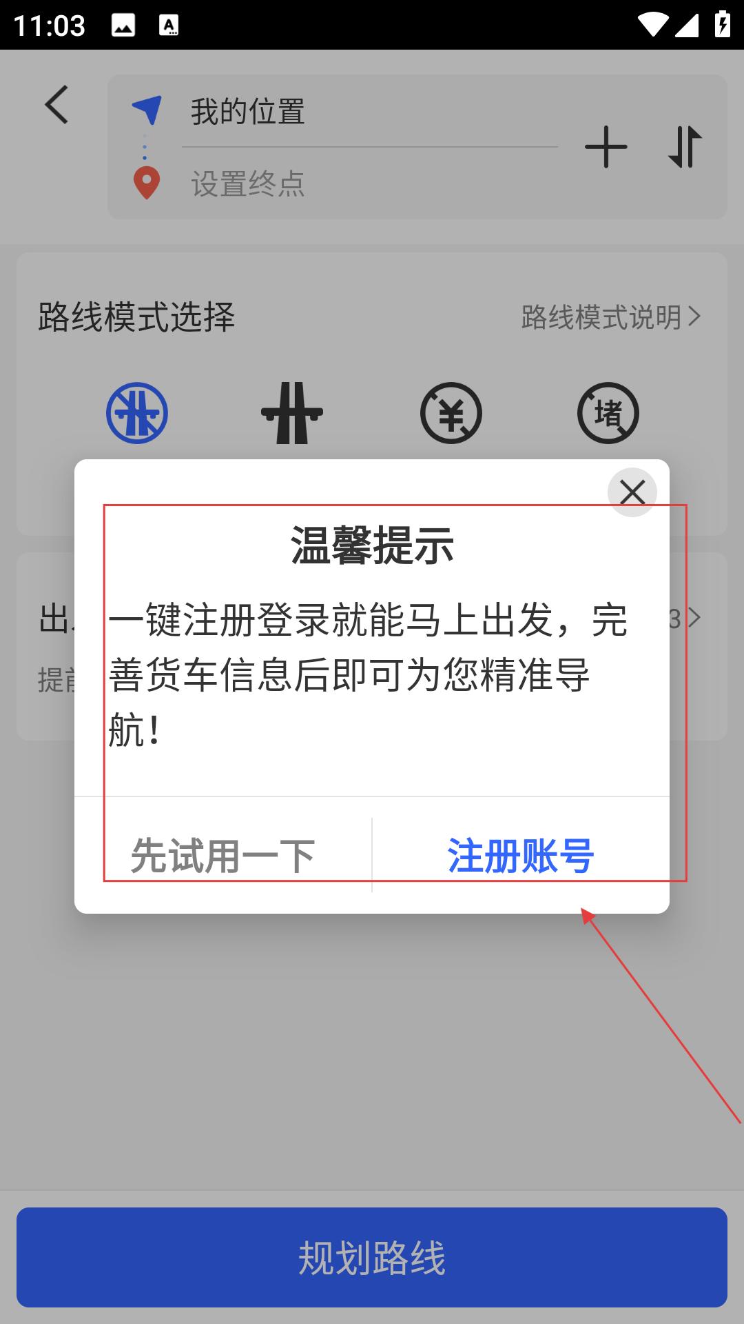 3、从同意协议,到导航页面,点提示操作,注册或试用,输入位置信息,规划路线,开始货车运输。